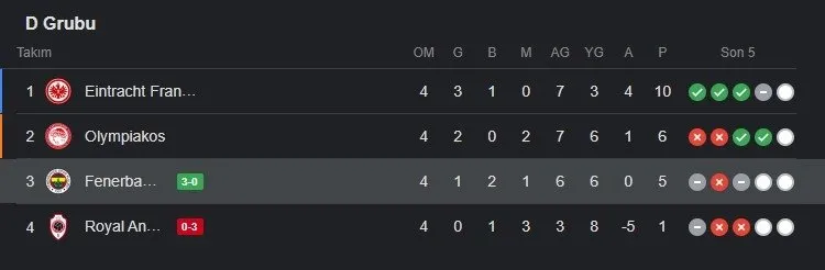 Royal Antwerp ise Eintracht Frankfurta konuk. Avrupa Ligi E Grubu canlı puan durumu. 3- Fenerbahçe 5 puan.